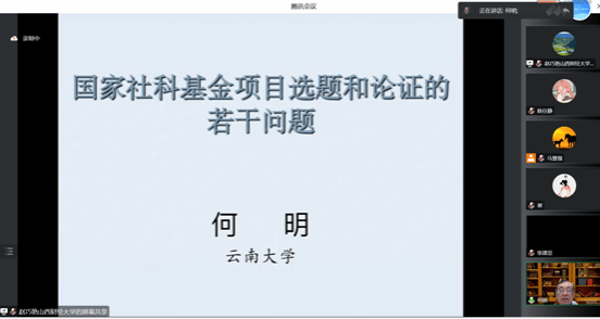 首先,何明教授为我们介绍了课题选题遴选的相关内容,指出国家社科基金项目的选题应该从课题指南出发,结合国家和社会的需要、个人研究基础和兴趣,最终选定课题题目。并指出课题遴选的原则是回应国家战略、问题意识明确、特色优势突出及表达准确简洁,为后续的讲述做了扎实铺垫。