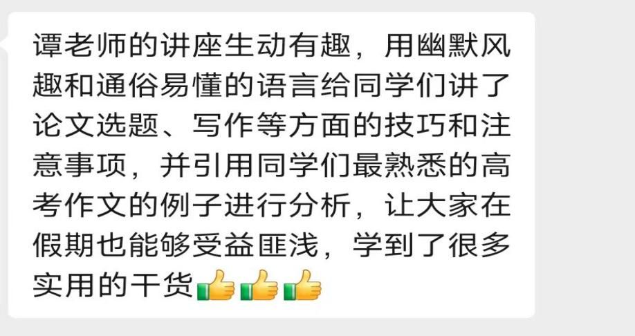 “谭老师的讲座生动有趣,用幽默风趣和通俗易懂的语言给同学们讲了论文选题、写作等方面的技巧和注意事项,并引用同学们最熟悉的高考作文的例子进行分析,让大家在假期也能够受益匪浅,学到了很多实用的干货。”黄继尧同学如是说。(撰稿:左桂萍)