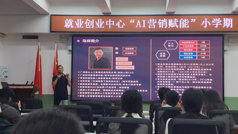 牵头组织的“AI赋能数字营销”主题小学期讲座在学生活动中心三楼举行。本讲座邀请广州核心人工智能科技有限公司创始人兼CEO陈坤担任主讲嘉宾,吸引了网络与新媒体、大数据等专业的百余名学生到场参与。